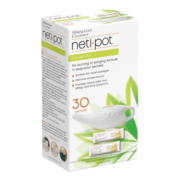 Eco Neti Pot with 30 Neti Salt Sachets – Himalayan Chandra Eco Neti Pot is a natural soothing saline nasal wash. Neti pots have been around for thousands of years, mainly used by yoga enthusiasts. The neti pot is an excellent way to clean mucus from the nose making medication more effective. They also clean allergens, irritants, bacteria and viruses from the nose reducing the frequency of infection. Furthermore, they help decrease swelling in the nose and increase air flow. Neti Pot is excellent for all ages.